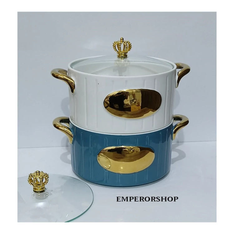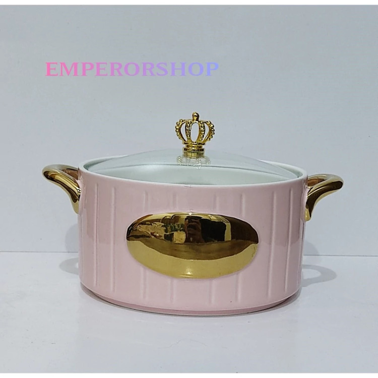 قابلمه سرامیکی سوپ خوری و دسرخوری مدل تاج طلایی درب پیرکس