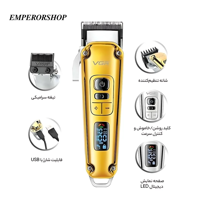 ماشین اصلاح سر و صورت حجم زن حرفه ای وی جی آر VGR اورجینال مدل V-006 (اصل) تیغه سرامیک باطری 2600 میلی آمپر
