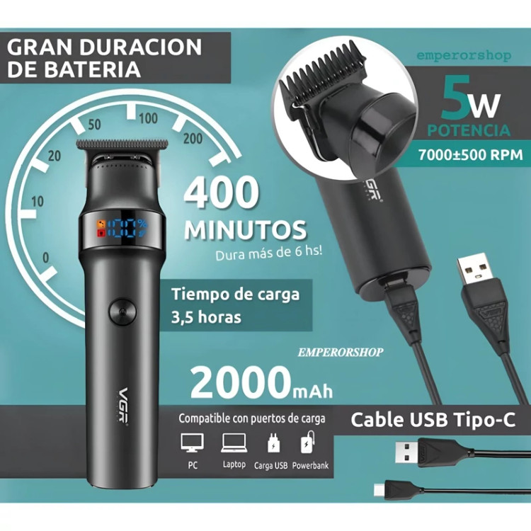 ◽مدت زمان کار: 400 دقیقه◽ زمان شارژ: 3.5 ساعت◽جنس تیغه: فولاد ضد زنگ ◽ ورودی: DC 5V 1A قدرت: 5W◽ دور در دقیقه: 7000 ◽حداقل طول برش: 0/1◽سایز شانه ها 1/5،3،4/5mm◽این دستگاه مجهز به موتور قدرتمند توربو با سرعتی که به 7000 دور در دقیقه می رسد،میباشد و می تواند موها را به راحتی و به نرمی کوتاه کند و یک مدل موی سریع و موثر به شما بدهد.