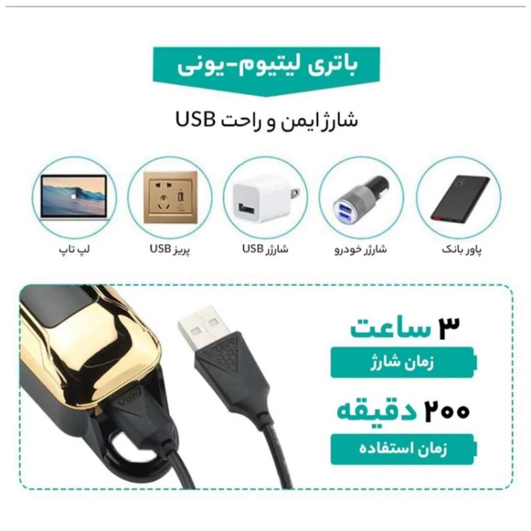 ◽منبع انرژی:باتری لیتیومی 2000 میلی آمپر ◽مدت زمان شارژ:3ساعت ◽مدت زمان شارژدهی:200 دقیقه ◽جنس تیغه:استیل پیشرفته ضدزنگ،تکنولوژی اصلاح taper سایز شانه های همراه 10mm 13mm 3mm 6mm